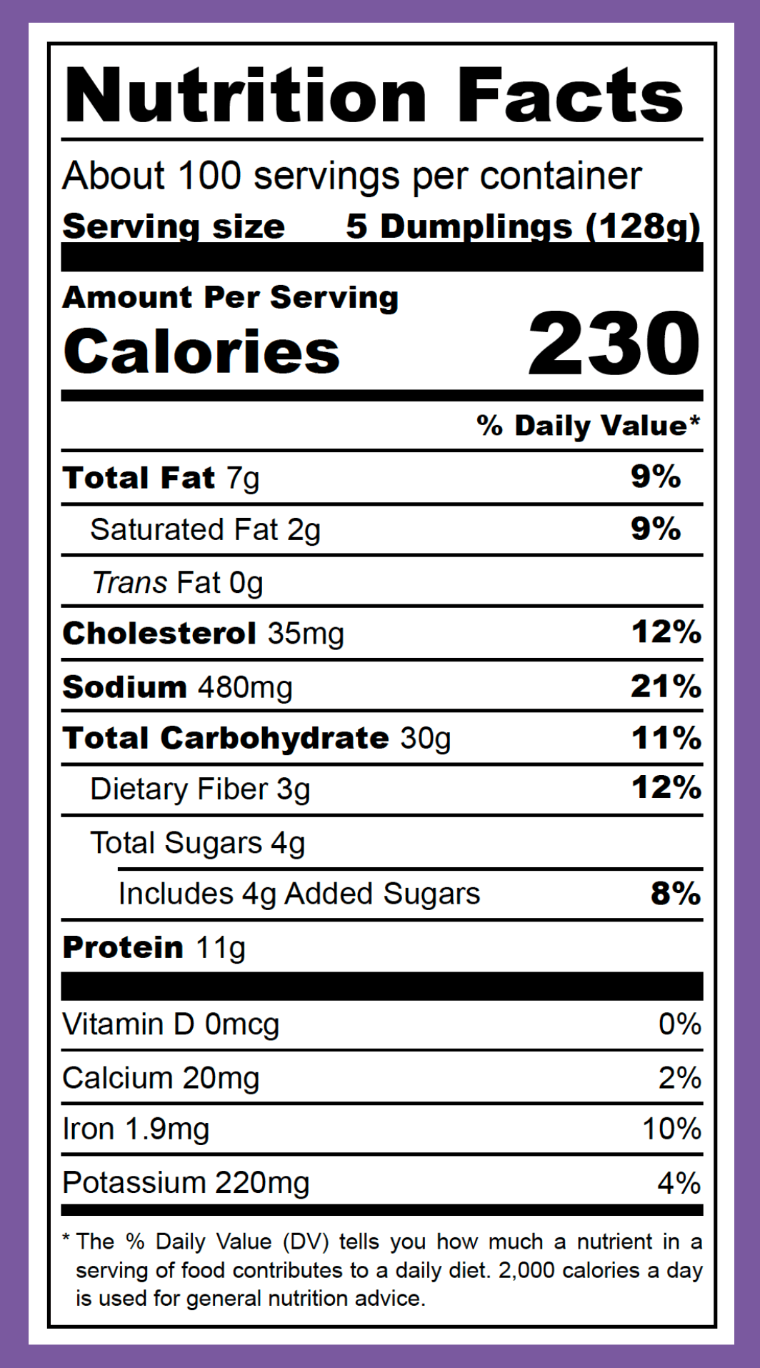 Our Chicken & Vegetable Dumplings are crafted specifically for students and with school kitchens in mind. Packed with chicken, cabbage, spring onions, cilantro and ginger in a thin whole wheat wrapper, each serving offers the recommended portions of both protein and grains for students up to grade 12 under the USDA National School Lunch Program (NSLP).