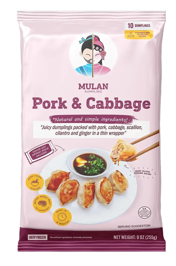 Filling: All Natural Pork, Cabbage, Green Onions, Ginger, Soy Sauce ( soybean, wheat and salt), Non-GMO Expeller Pressed Canola Oil, Cilantro, Salt, Organic Cane Sugar, 100% Pure Sesame Oil, Black Pepper, Garlic Powder.